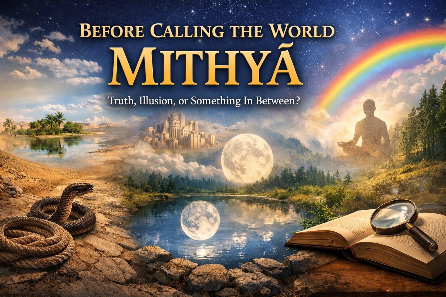 A barren woman’s son, a snake seen in a rope, water seen in a mirage, the blue sky above us, a rainbow in the distance, a reflection in a pond, a dream city, and the world of daily experience do not all belong to the same class. Yet in casual speech they are often thrown together under words like false, unreal, illusory, or mithyā. That is not a small mistake. It is a serious philosophical carelessness.